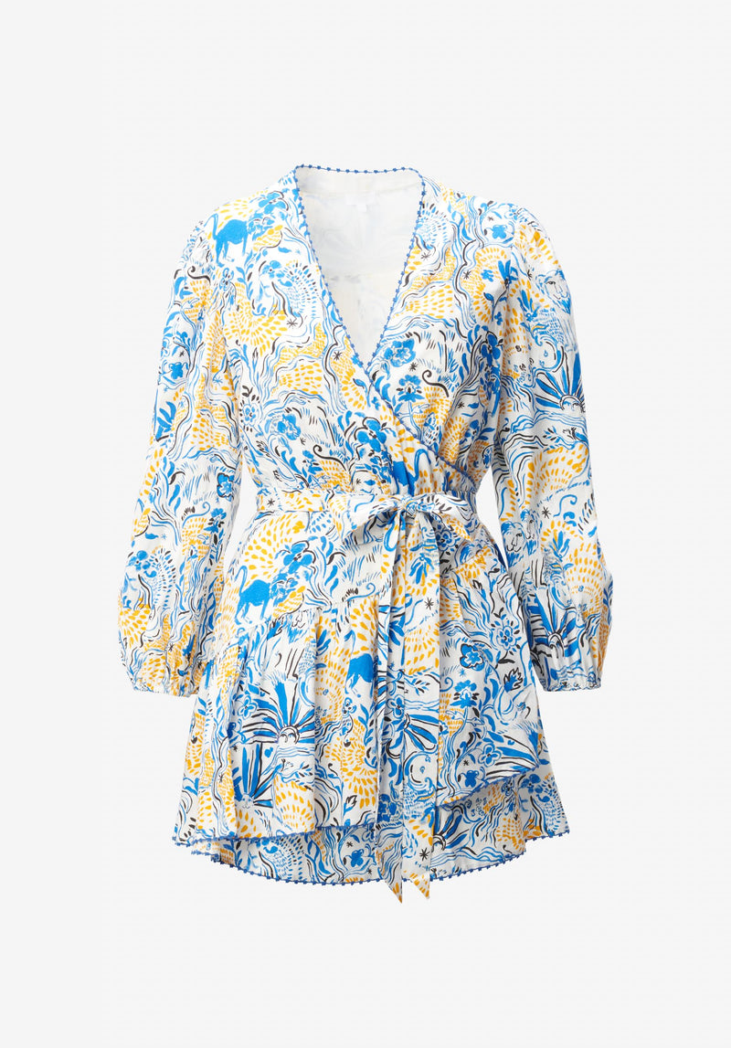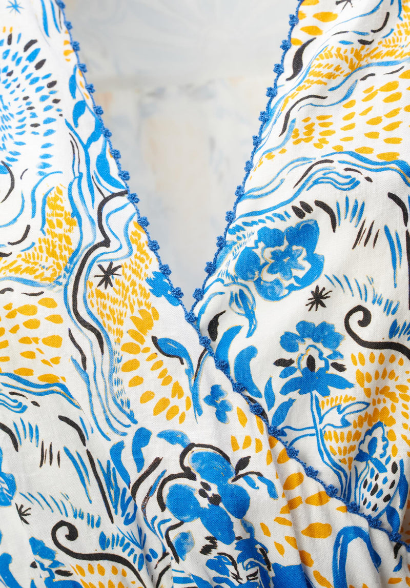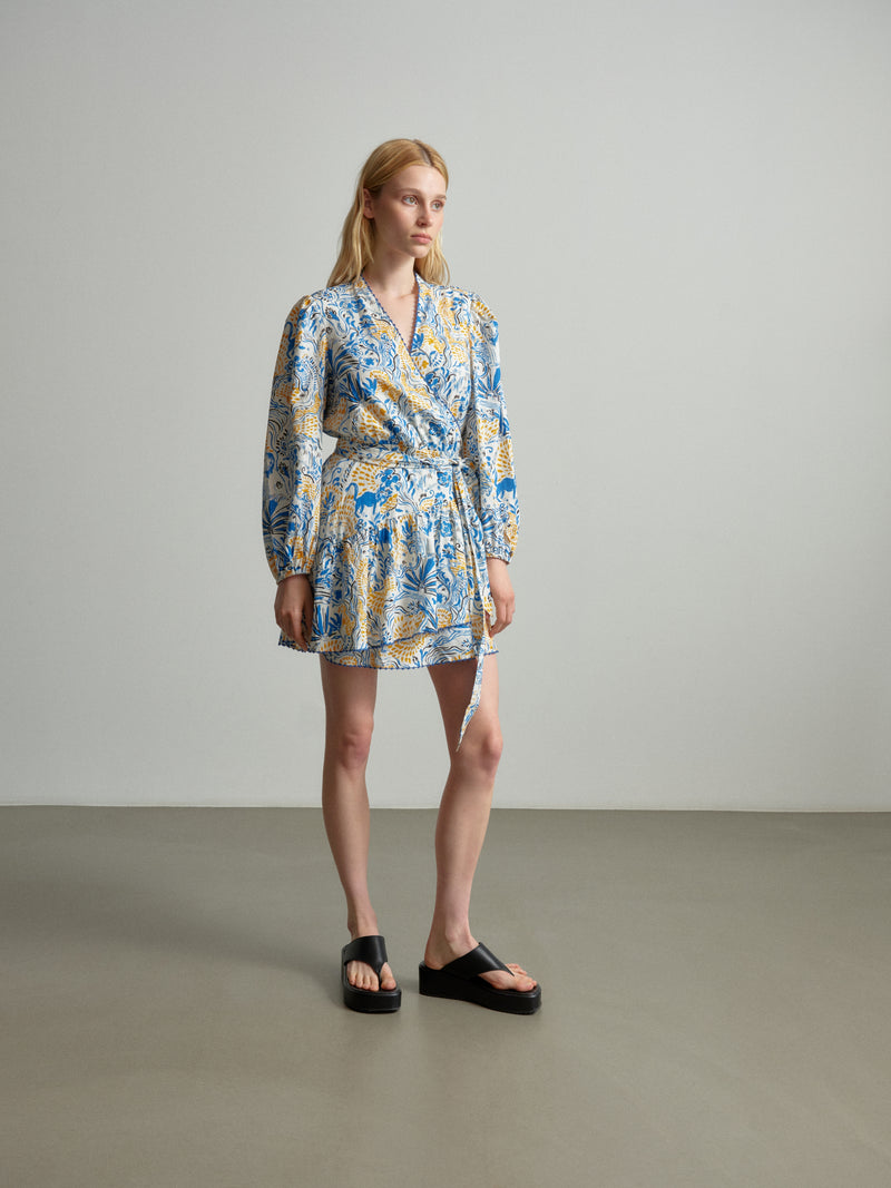 Embrace effortless elegance with our Dress Dilovan! Meticulously crafted from a luxurious linen viscose blend, this wrap dress features our brand-new "Magic Garden Day" print, inspired by the lion women of Tehran. With gathering at the front for a flattering fit and voluminous sleeves with elastic hems for a touch of drama, it exudes sophistication. Complete with ornamental stitch details, this dress is a must-have for any fashion-forward woman.
