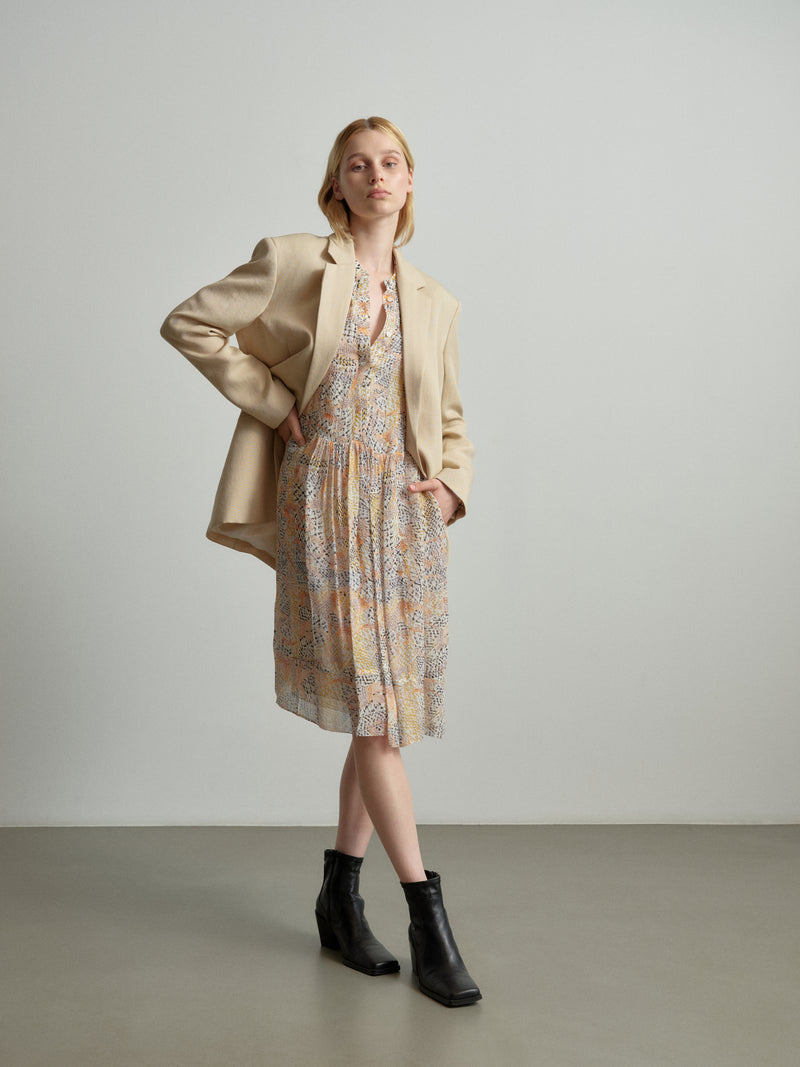 A floral pattern reminiscent of Persian gardens inspired our heritage print for Spring-Summer 2024. The classic lala hop-in dress is back this season. It features feminine smoking at the front, pockets in the side seam and is made of flowy viscose georgette that is both comfortable and easy to wear.