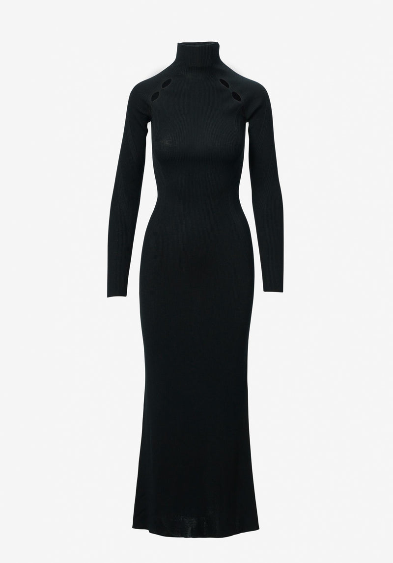 It is a sexy knit with an incredible feel. A seamless raglan knit dress in 100% wool complements your curves with its figure-hugging bodycon fit. There is a mock neck and cut-out details that contrast beautifully.