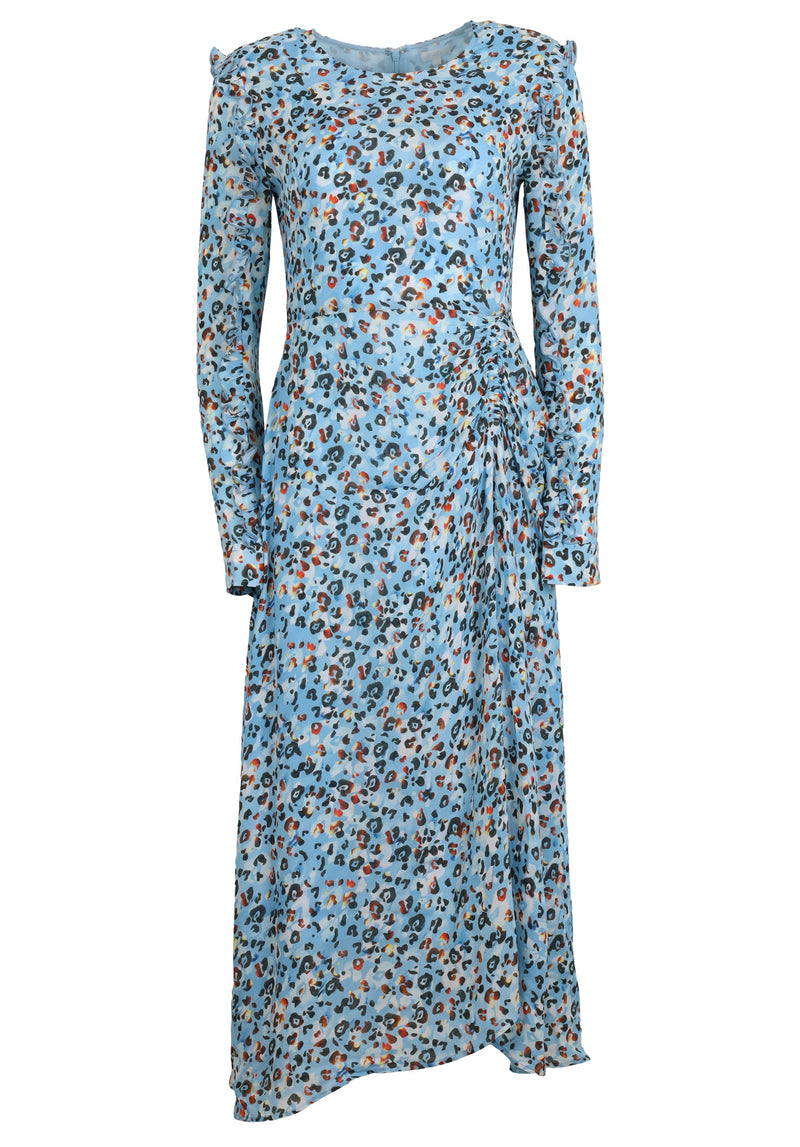 A beautiful and feminine dress made of premium silk and viscose blend with delicate flounces, carefully placed ruching details and a wild leopard print that is perfectly accentuated by the crisp light blue background.This item has been loved by someone before you, but we made sure that it is in top condition. If you order a new item in the same order as this one, you will receive 2 packages, but they will be shipped to the same delivery location. You will receive two tracking codes, one for each package, when we have shipped your packages.