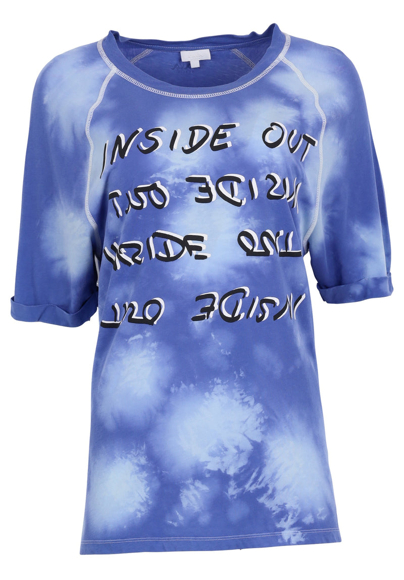 A deep blue boyfriend shirt made of 100% cotton, featuring a tie-dye effect and slogan prints to front.This item has been loved by someone before you, but we made sure that it is in top condition. If you order a new item in the same order as this one, you will receive 2 packages, but they will be shipped to the same delivery location. You will receive two tracking codes, one for each package, when we have shipped your packages.