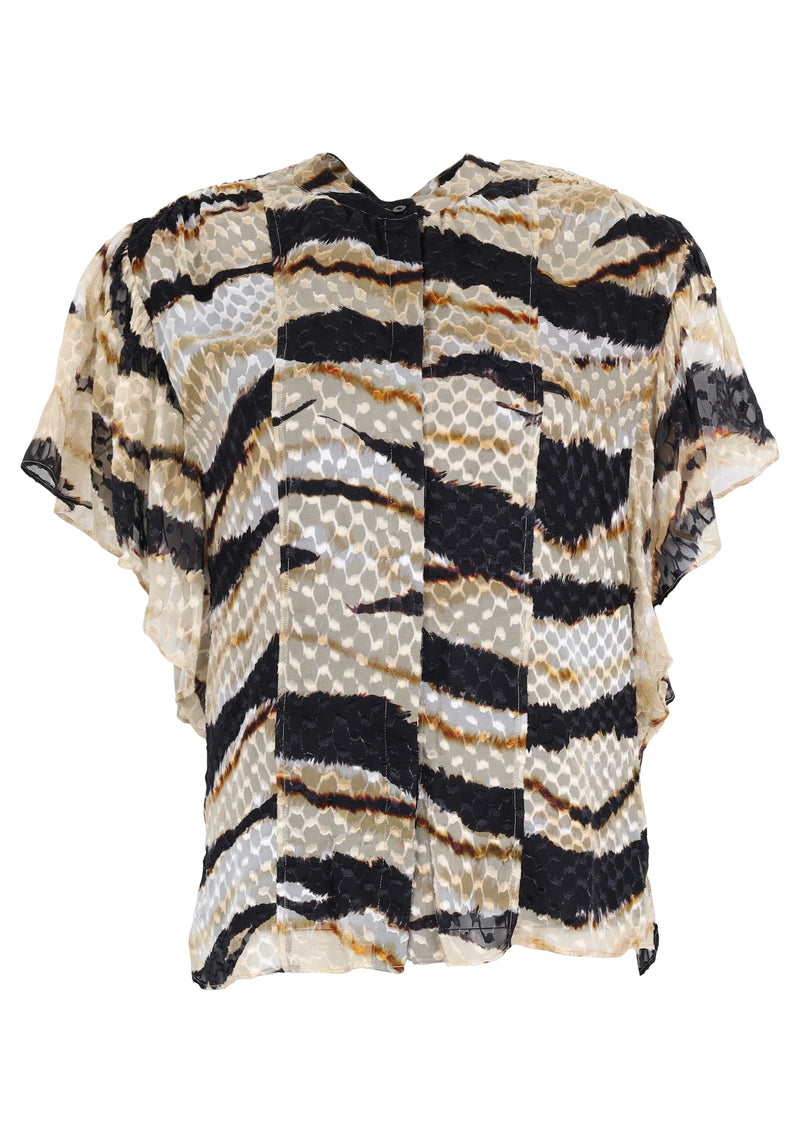 Top Tasha is feminine, yet easy to wear, made of soft silk-viscose-devoré. Artfully juxtaposing the sexy and strong Brushed Tiger Print with the romantic butterfly sleeves. This gorgeous, versatile design is rounded out with a stand-up collar and an elegant button placket.This item has been loved by someone before you, but we made sure that it is in top condition. If you order a new item in the same order as this one, you will receive 2 packages, but they will be shipped to the same delivery location. You will receive two tracking codes, one for each package, when we have shipped your packages.