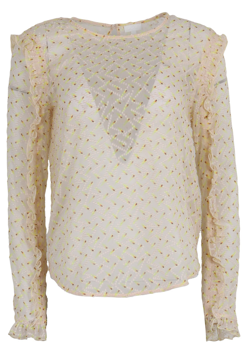A feminine t-shirt-top made of a soft silk and cotton blend in a soft yellow color with playful flounces on the shoulders and sleeves that make for an elegant silhouette.This item has been loved by someone before you, but we made sure that it is in top condition. If you order a new item in the same order as this one, you will receive 2 packages, but they will be shipped to the same delivery location. You will receive two tracking codes, one for each package, when we have shipped your packages.