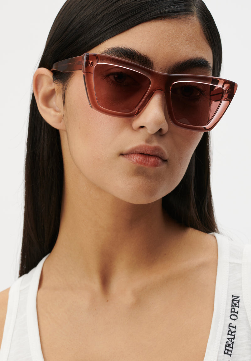 An exclusive capsule collection of limited edition sunglasses by Austrian eyewear brand ANDY WOLF and lala Berlin. Two harmonious and expressive sunglasses capture the lala Berlin vibe and complement the label's current beachwear collection. LIV is a feminine, geometric cat-eye frame with an inner facet around the lens edge. The fresh, monochromatic berry color scheme has matching burgundy lenses. The lenses are high quality ZEISS sun lenses that offer 100% UVA and UVB protection.