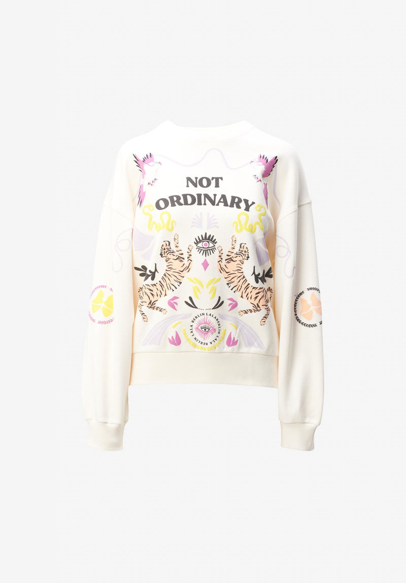 Crafted from heavenly soft cotton, this piece seamlessly combines sporty femininity with bold style. Sculpted sleeves and an oversized fit ensure both comfort and a striking silhouette, while featuring artwork proclaiming, "Not Ordinary". Elevate your look with this statement piece, perfect for lounging or making a statement on the go.