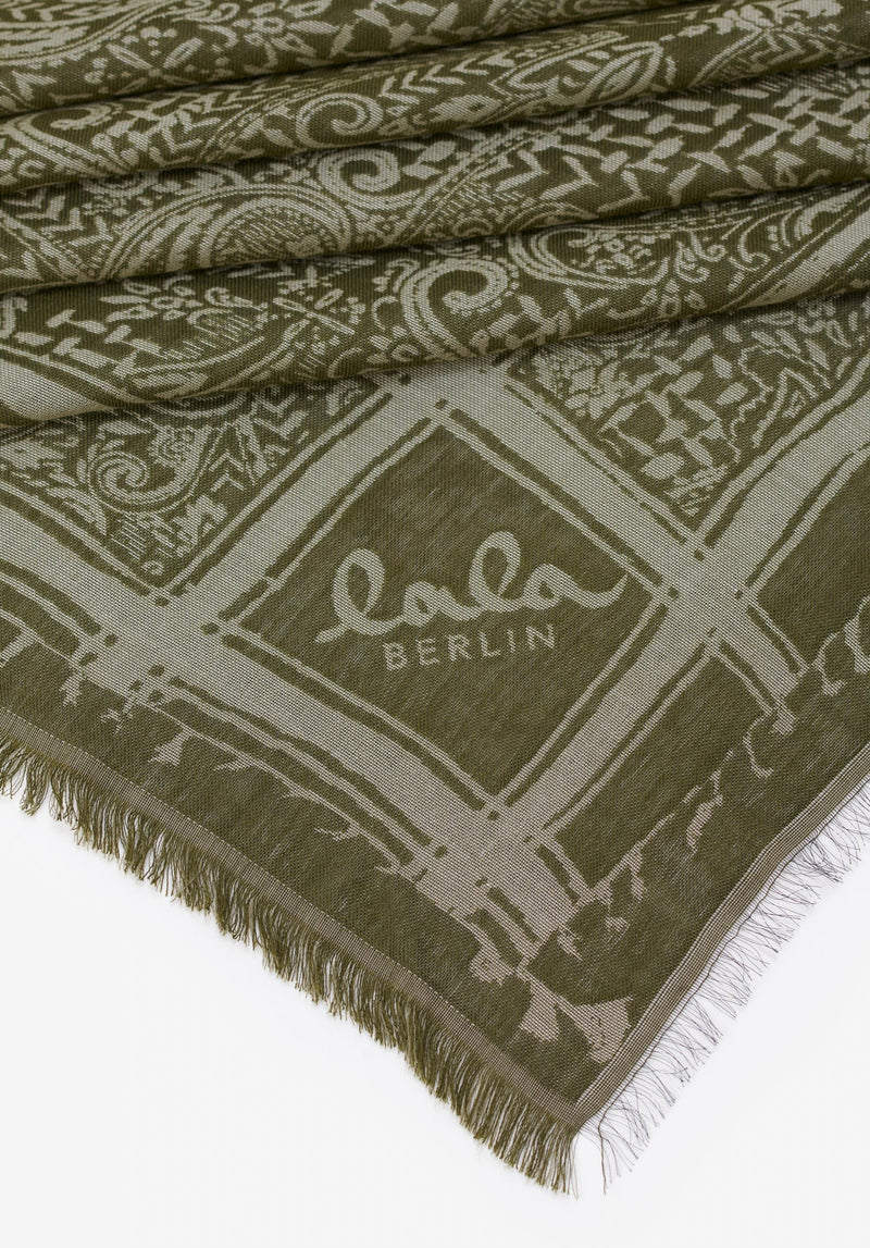 Inspired by Persian boteh ornaments and oriental carpets in mushroom and olive shades, our triangular Amalin scarf is here to amaze! Made of viscose, cotton and modal will effortlessly complement all your summer looks with a touch of softness.