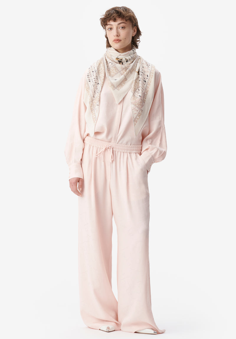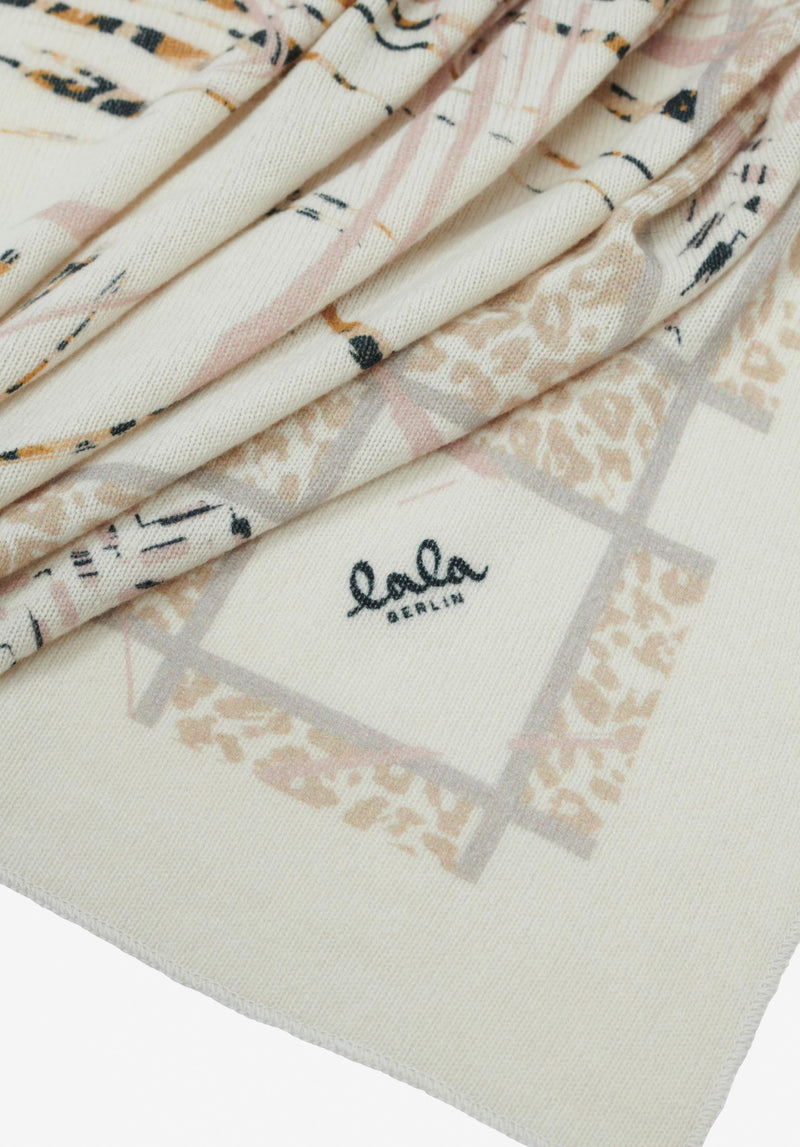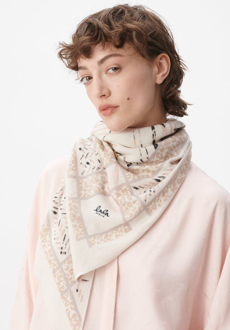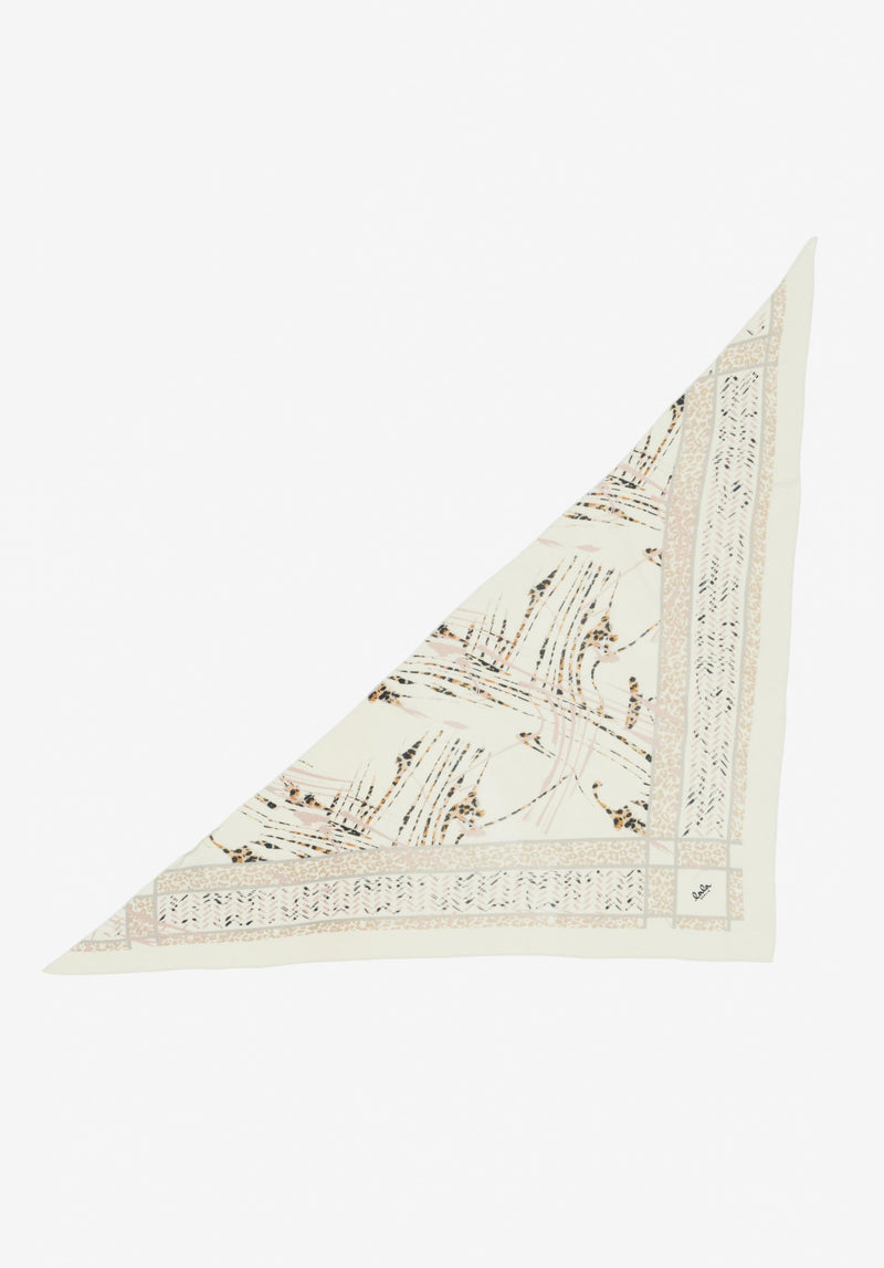 This cashmere triangle is embellished with one of the vibrant prints for fall/winter 23. A subtle leo is combined with artful swirls on a soft off white background.