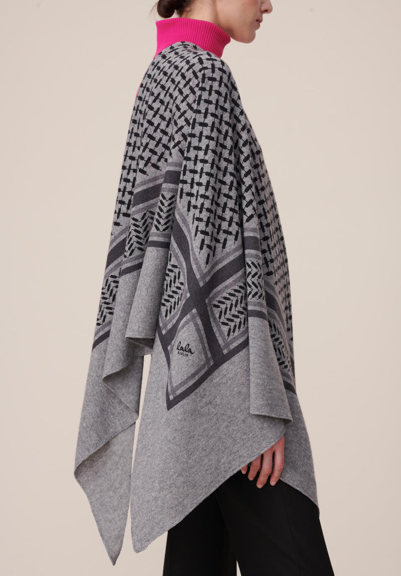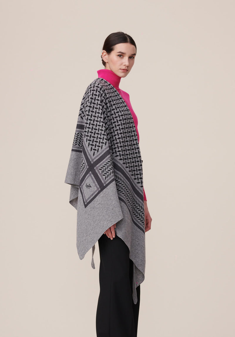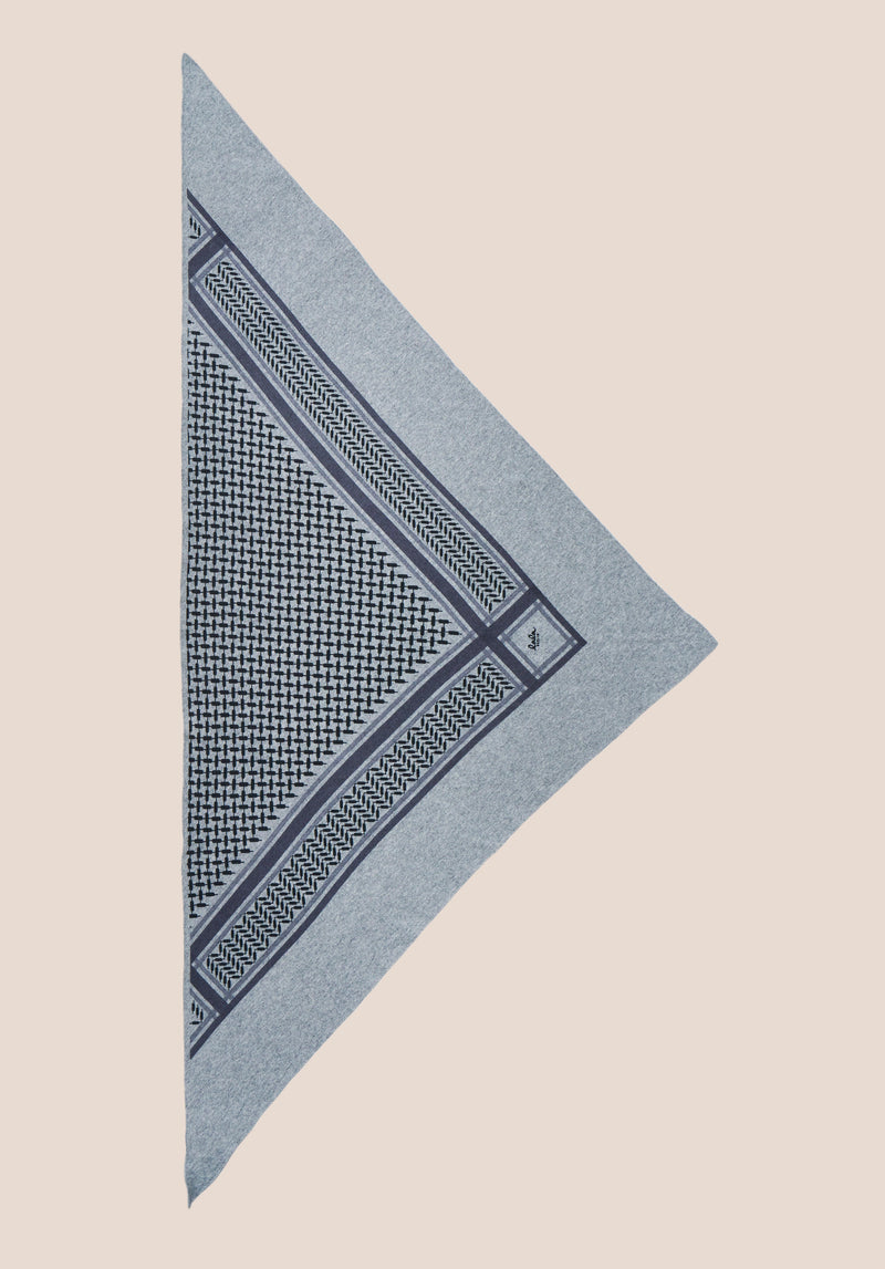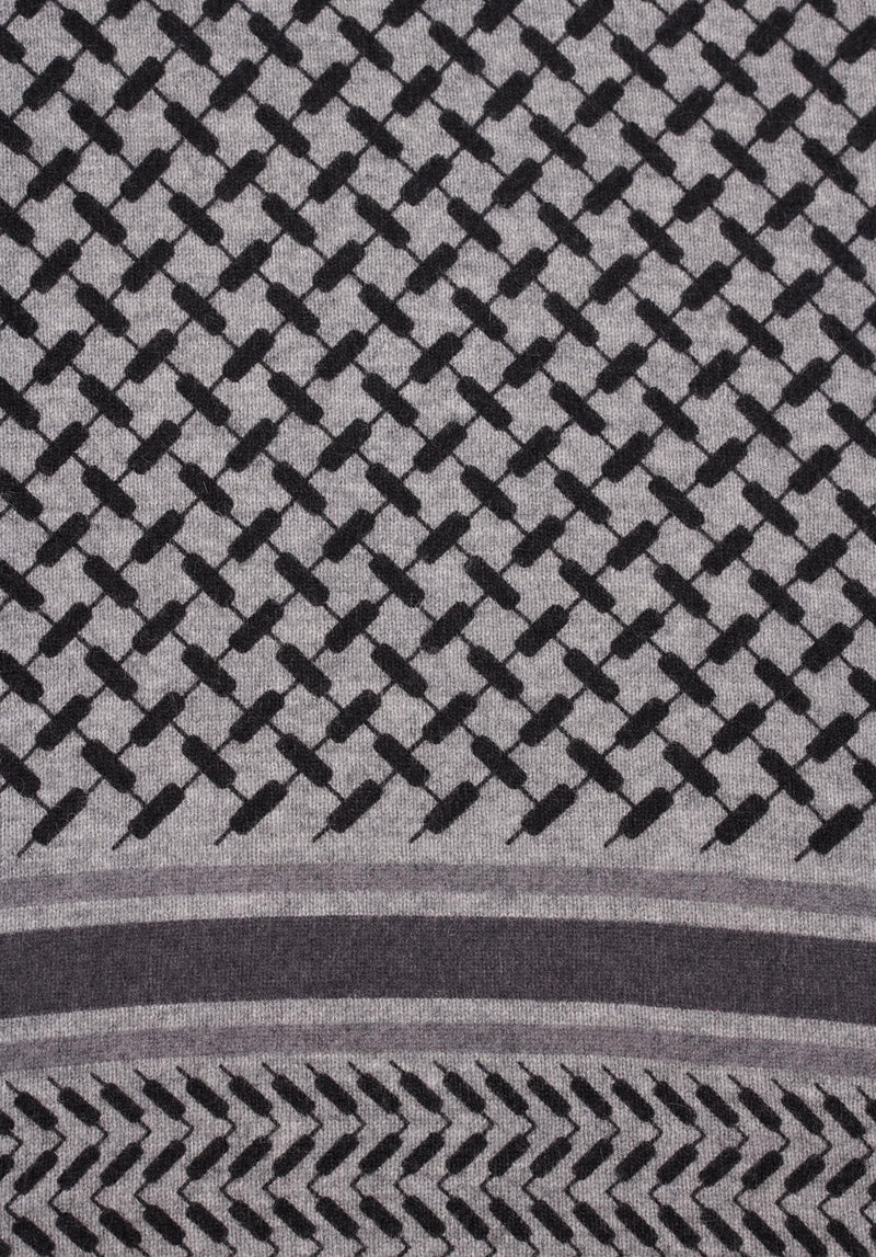 A large luxuriosly soft, triangle shaped cashmere scarf, featuring a classic black Kufiya print on a medium grey background.