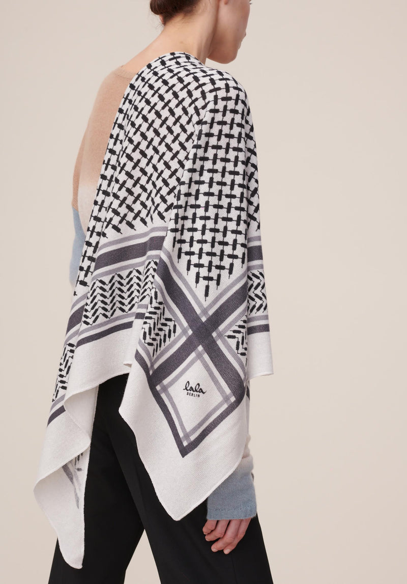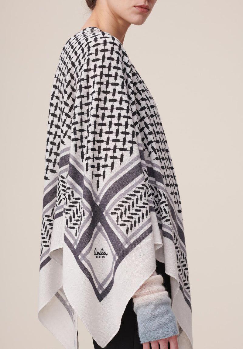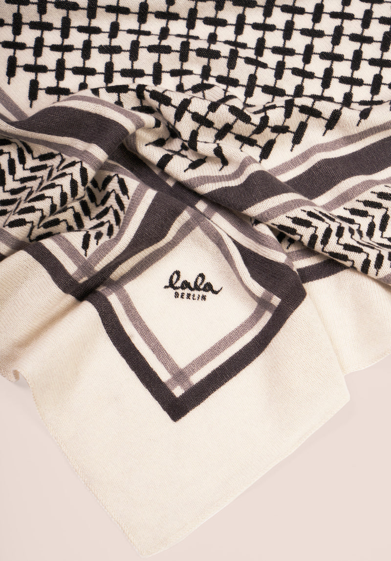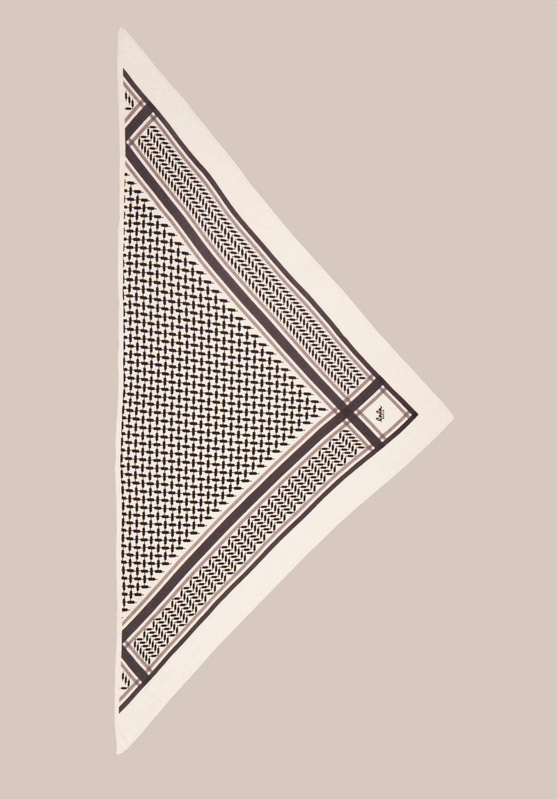 A luxuriosly soft, triangle shaped cashmere scarf, featuring a classic black Kufiya print on off-white background.