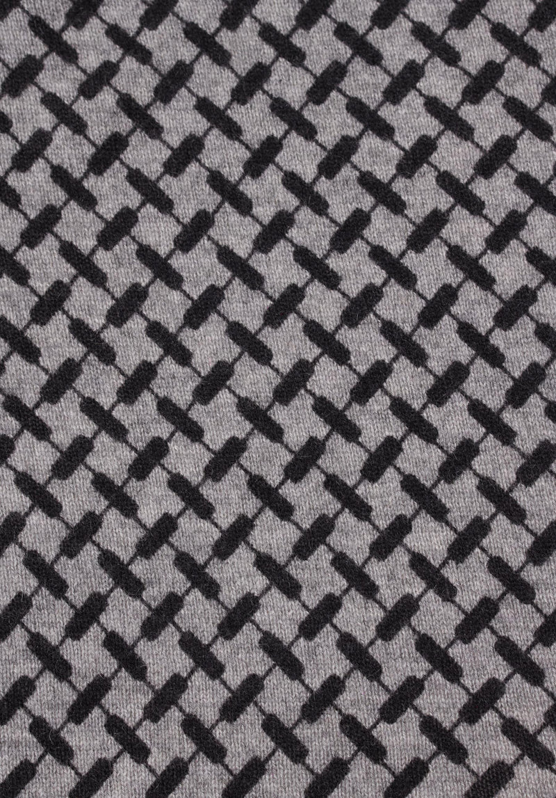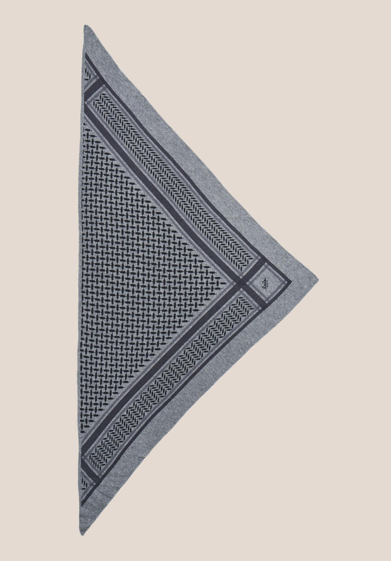 A luxuriosly soft, triangle shaped cashmere scarf, featuring a classic black Kufiya print on a medium grey background.