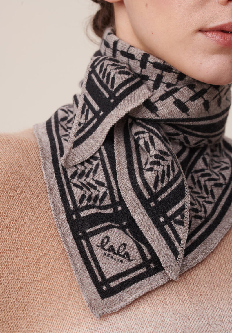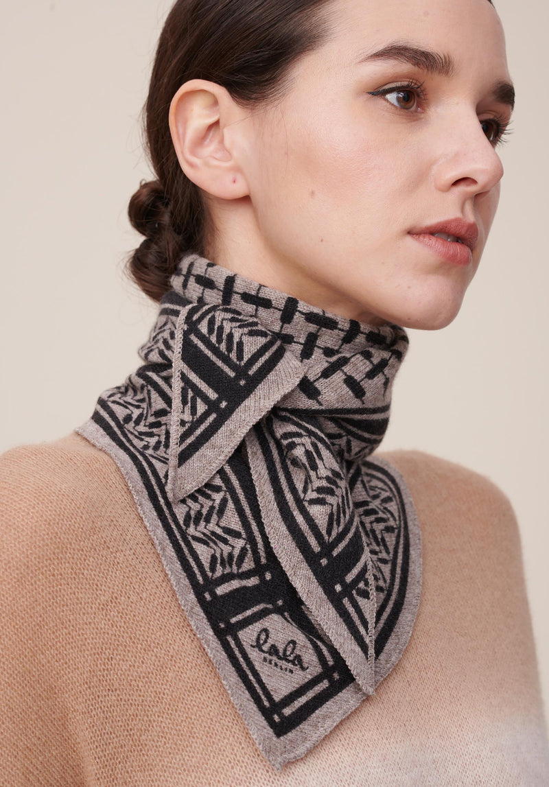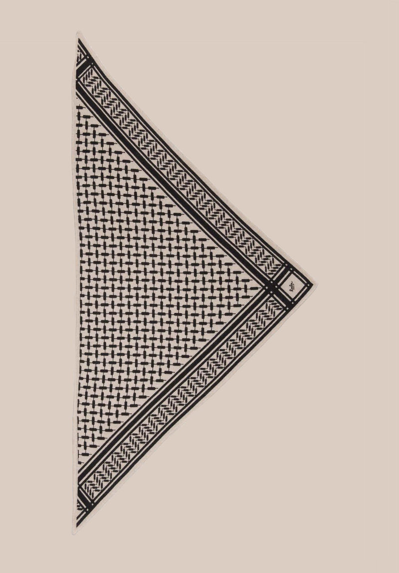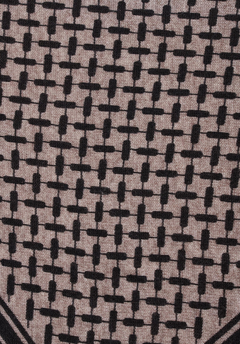 A luxuriosly soft, triangle shaped cashmere scarf, featuring a classic black Kufiya print on a soft brown background.